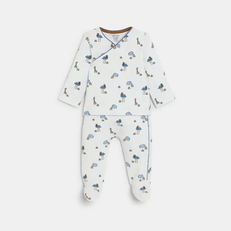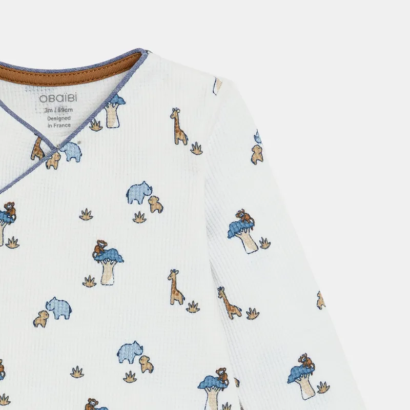 Được làm từ vải dệt kim tổ ong mềm mại, thoải mái, áo được buộc chặt bằng khuy bấm ở phía trước để dễ dàng mặc cho bé.